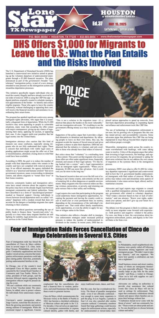 Lone Star edition #37 Posted by Mauricio Hidalgo | May 15, 2025 | Uncategorized | 0 | Find our weekly edition of Lone Star at our distribution points, the Houston newspaper completely FREE! Call us and place your ad in our newspaper to become part of the Lone Star family!