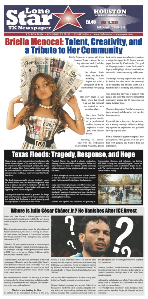 Lone Star edition #45 Posted by Mauricio Hidalgo | Jul 24, 2025 | Uncategorized | 0 | Find our weekly edition of Lone Star at our distribution points, the Houston newspaper completely FREE! Call us and place your ad in our newspaper to become part of the Lone Star family!
